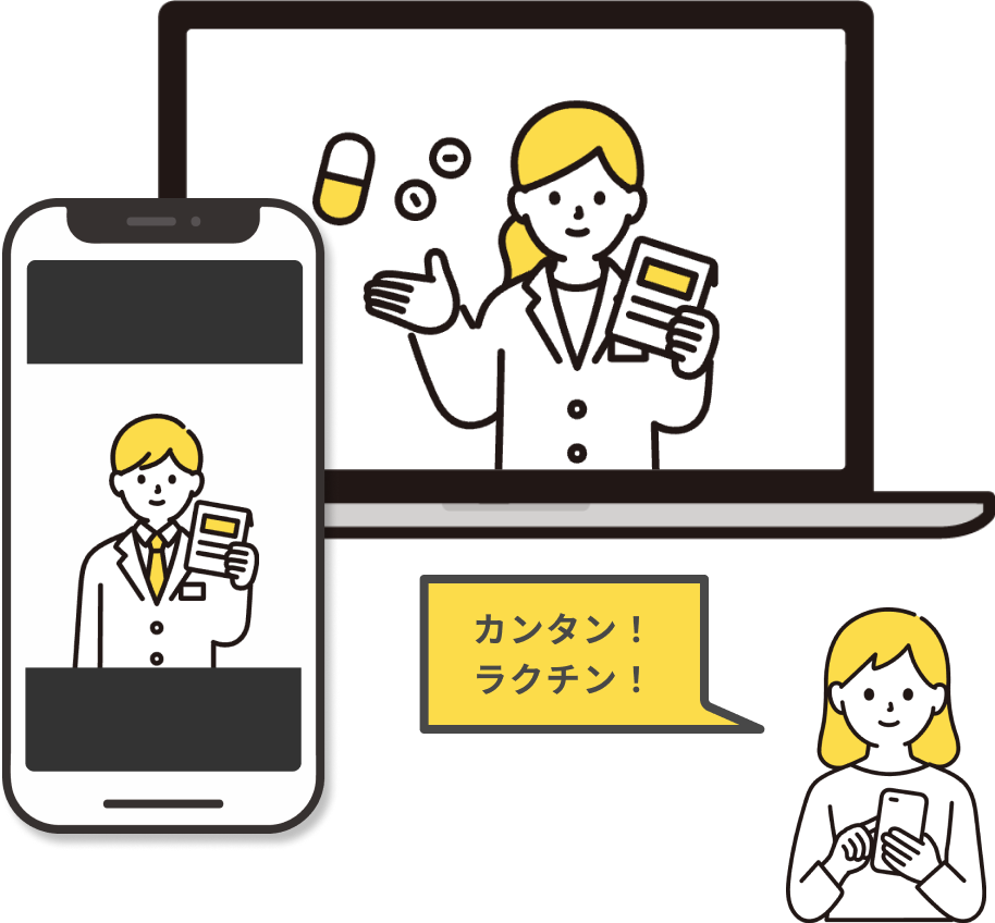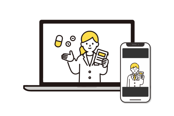 オンライン服薬指導とは、ビデオ通話を使用して薬剤師が直接患者に服薬指導を行うサービスです。指導後には薬局から直接ご自宅へ薬を発送いたします。患者様の薬局に足を運ぶ手間を省き、負担なく医薬品を受け取ることができます。